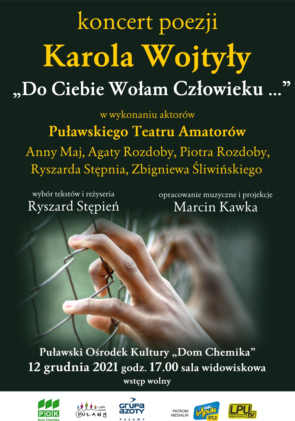 "Do Ciebie wołam Człowieku..." to niezwykły koncert poezji Karola Wojtyły w wykonaniu aktorów Puławskiego Teatru Amatorów: Agaty Rozdoby, Anny Maj, Ryszarda Stępnia, Zbigniewa Śliwińskiego i Piotra Rozdoby.