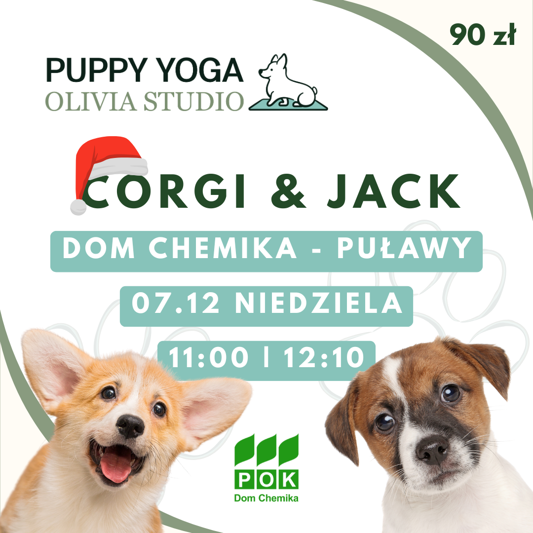 Już 7 grudnia w POK "Dom Chemika" odbędą się wyjątkowe zajęcia Puppy Yogi, organizowane we współpracy z Olivia Studio! To niepowtarzalna okazja, by połączyć relaksującą praktykę jogi z radością płynącą z obecności uroczych szczeniaków – Corgi i Jack Russell Terrierów.